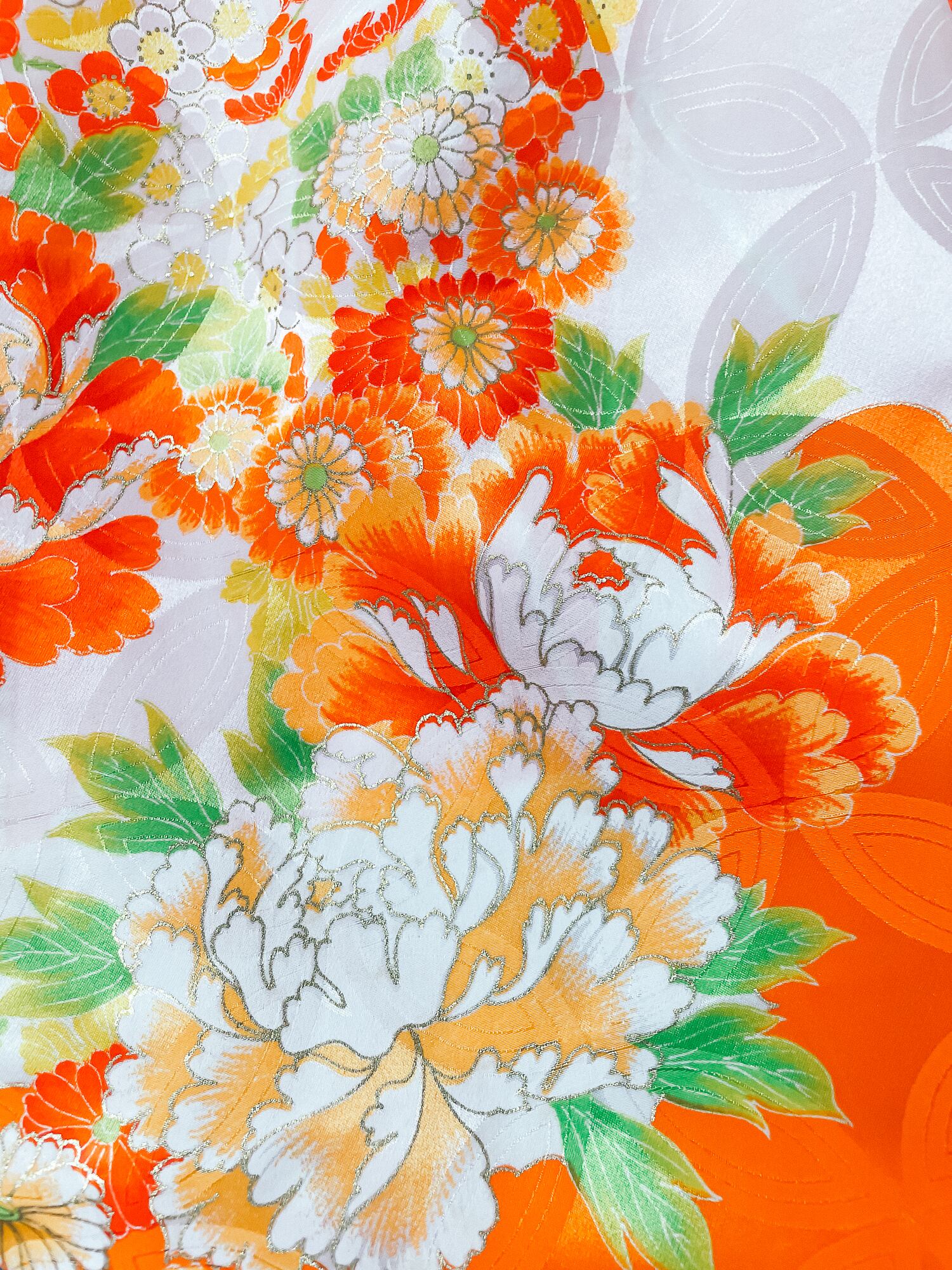 華やかなオレンジ色のアンティーク着物【七宝】。