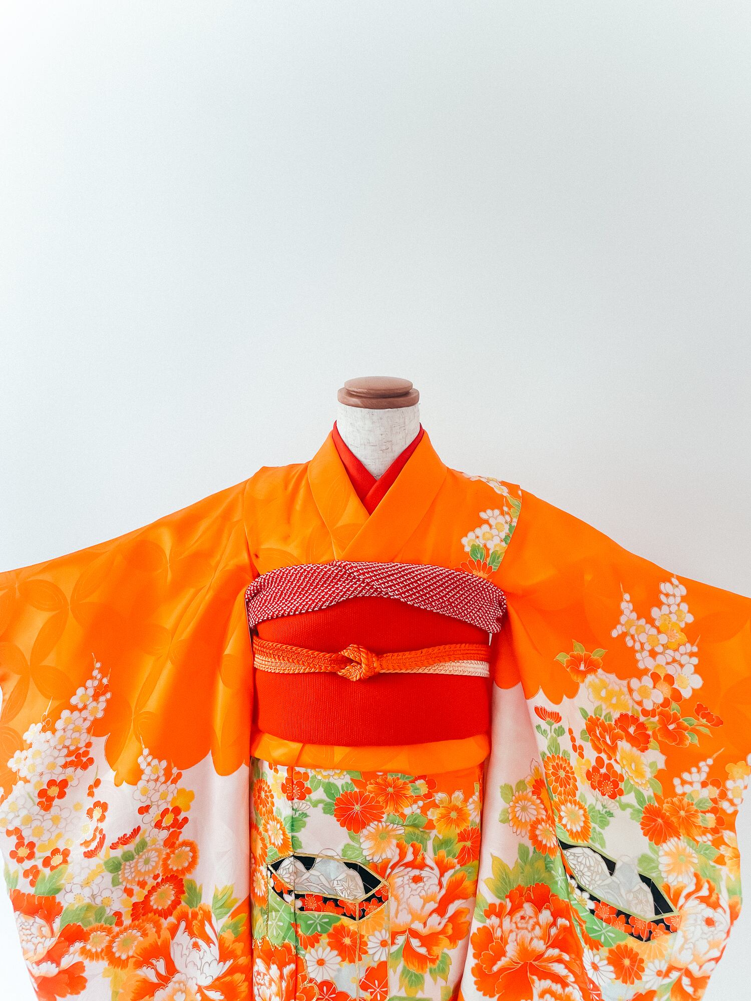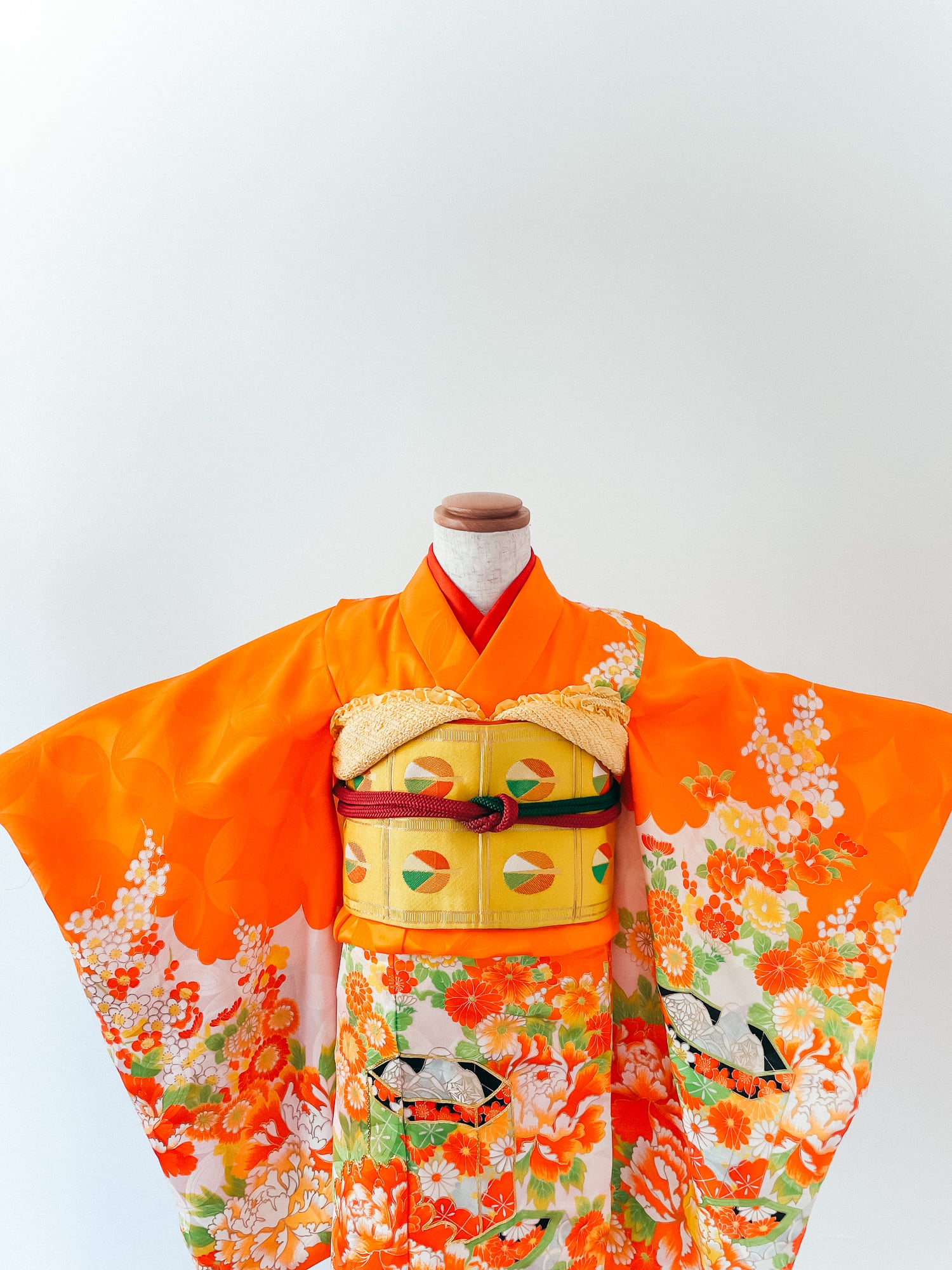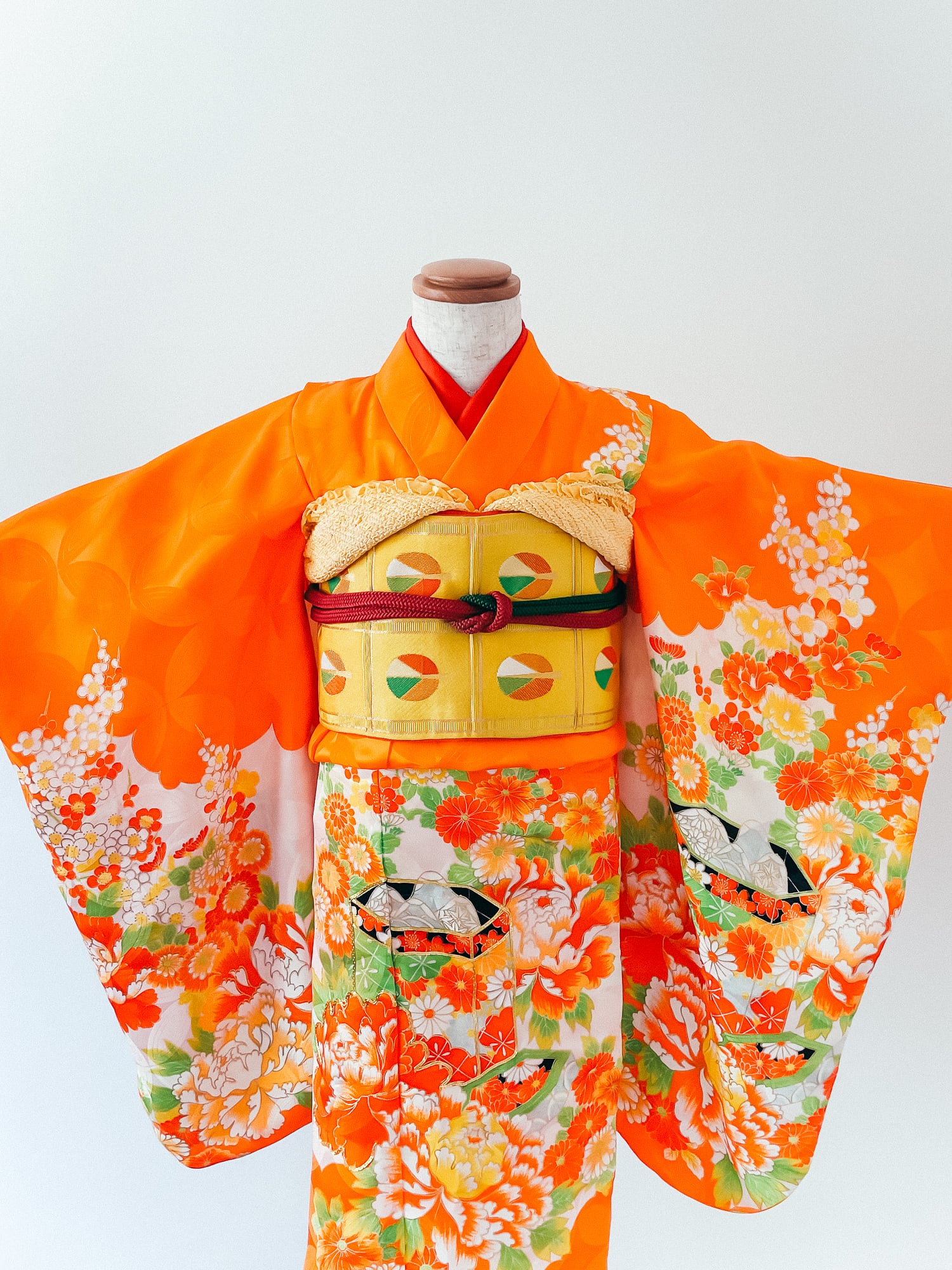 華やかなオレンジ色のアンティーク着物【七宝】。